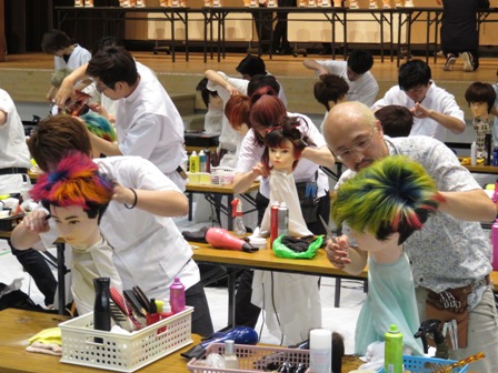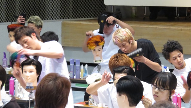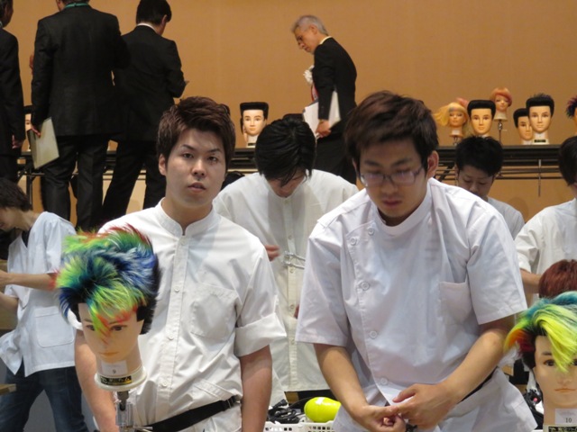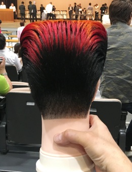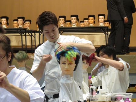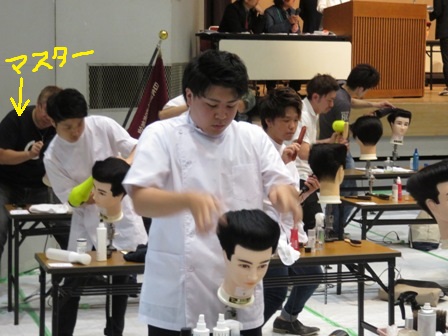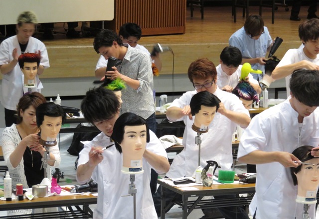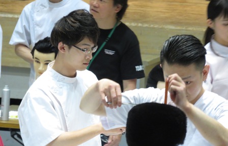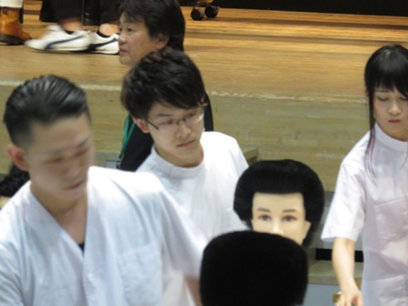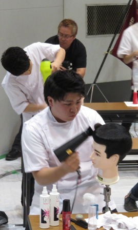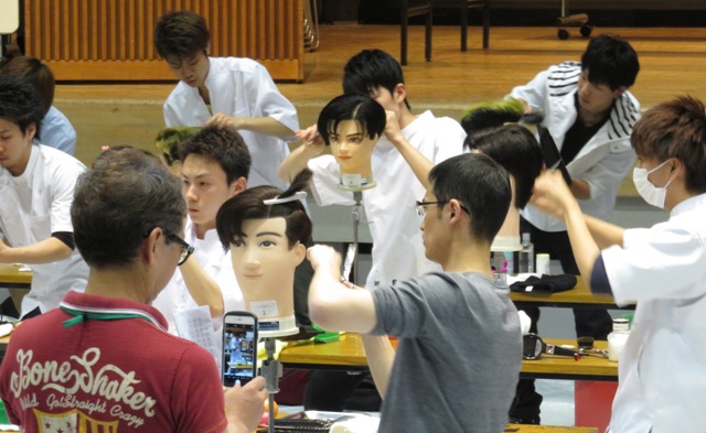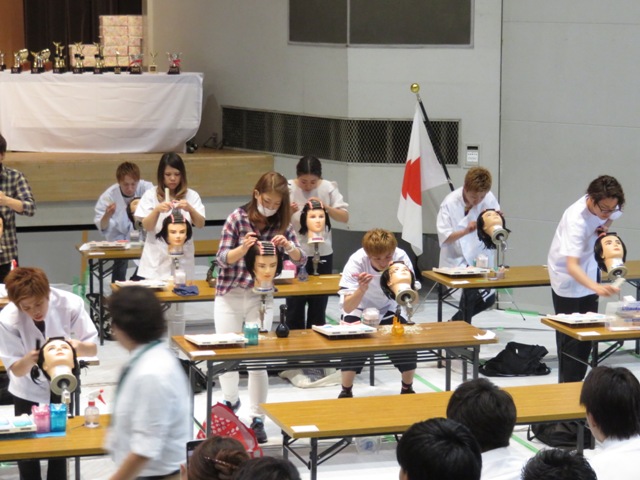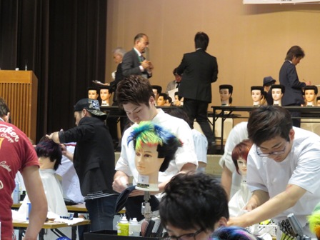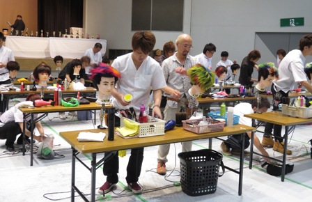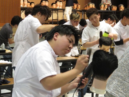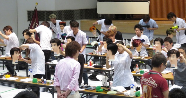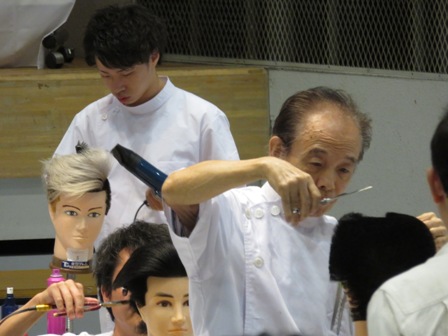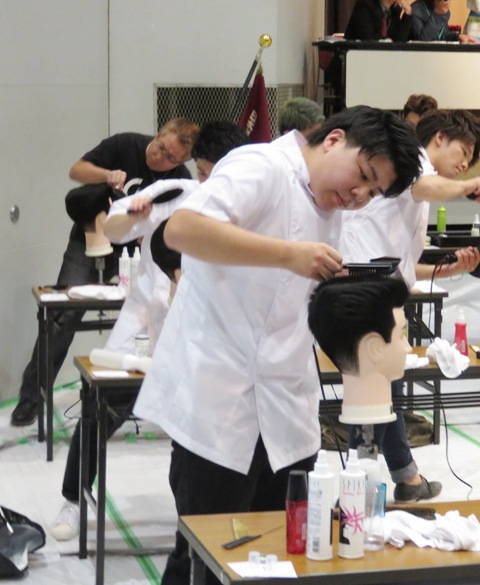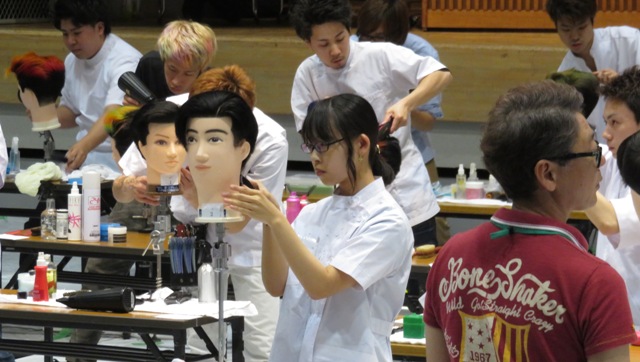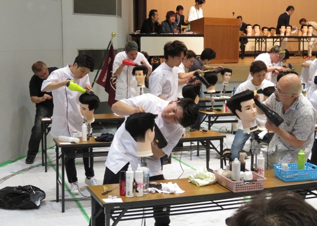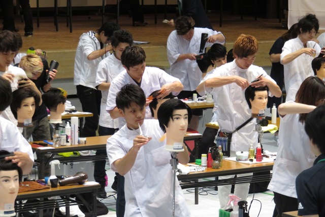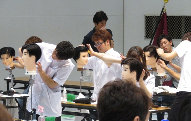 手前で競技しているのは理容学校生の国家試験科目でもあるインタースクールミディアム部門です。