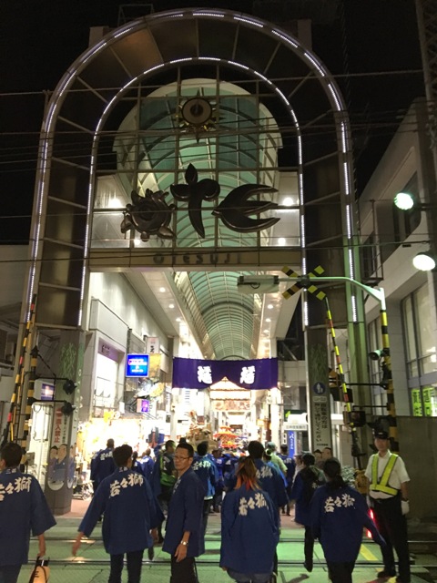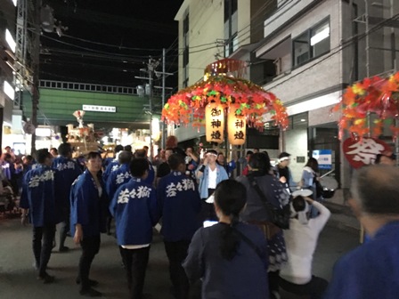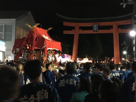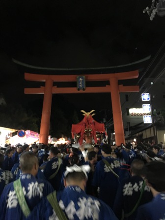 夜店がいっぱいの境内へ神輿が入っていきます!