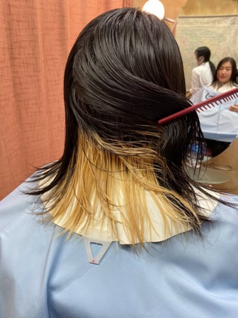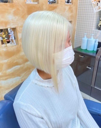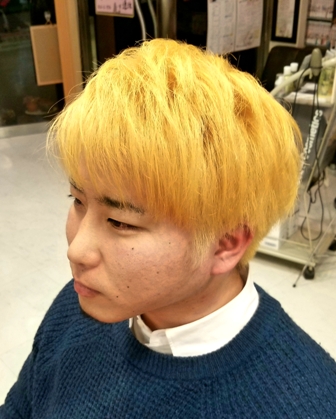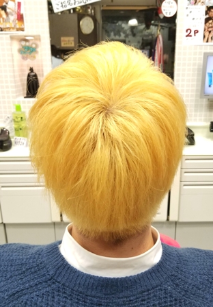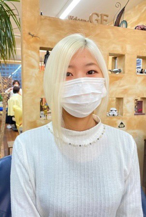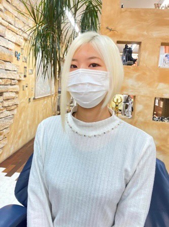 | ブリーチ後→ ブリーチの辛いところは、髪の損傷が激しいこと、今回のように根元まで染める場合頭皮に痛みを感じ、肌荒れが起きる可能性があることです。耐えきれないほどの苦痛を感じたときは、すぐに洗い流させてもらいます。 根元を避けてカラーすることも可能ですので、ある程度の長さがある方はそちらの方法もございます(^−^) |