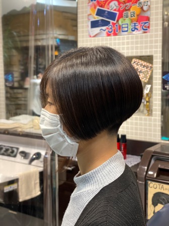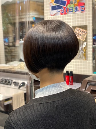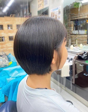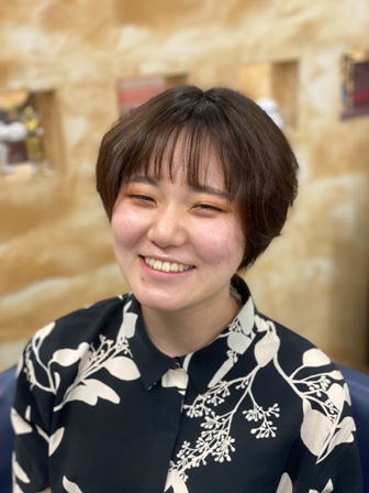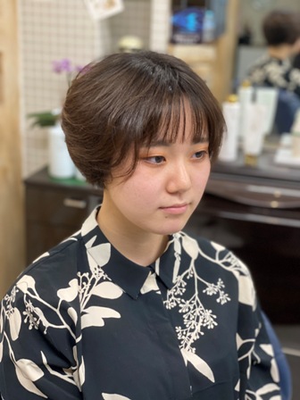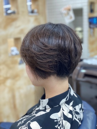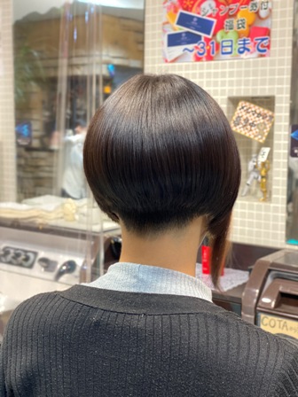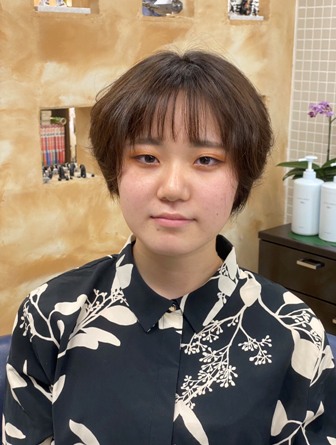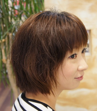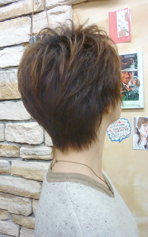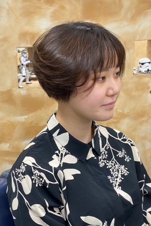 i/sannは髪が多く特に後頭部が細かいクセ毛の為にふくらみやすい状態。 リペアでいらないクセだけを取ってショートの自然な丸みを出しました。 朝のお手入れは寝癖だけをしっかり取ってあとは根元を起こすように中にドライヤーをあてて毛先は内巻きにフィンガーブローね! 仕上げにWAXを毛先になじませもOK! |