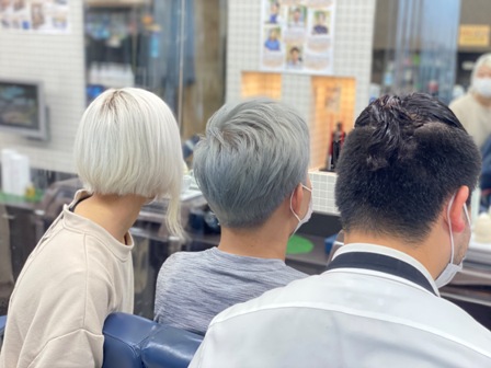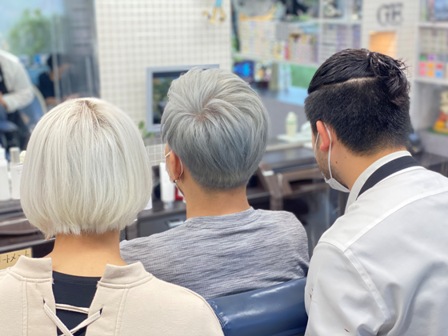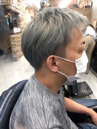 そしていよいよWカラーです! きれいに仕上がりました! ブリーチを重ねて色をぬくほど傷みとの戦いにはなりますが、その分カラーの染まり具合や色の透明感がきれいになっていきます! 時間経過とともに少し色が抜けていきより自然なシルバー系になっていきます。 社会人の方でもこれぐらいなら許してもらえそうですね! (ブリーチ後ホーユーのプロマスターMT7/6、OX3%使用)