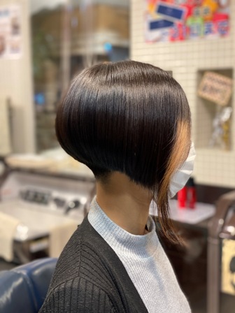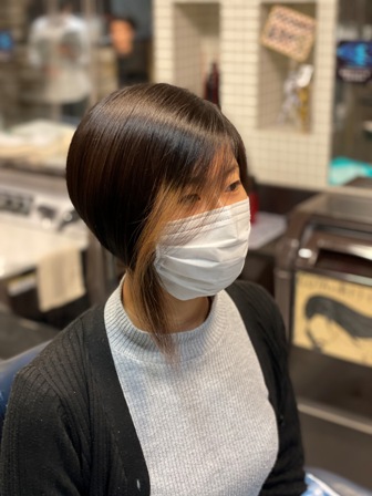 mh/san 前下がりボブのキュートな感じにいたしました! サイドは耳にかけるとまた違った感じが楽しめますね! 髪が多い人はえりあしなどにツーブロックを入れても良い感じになります! 髪質にあわせいろんな御提案が出来るスタイルです! 是非御相談ください! |