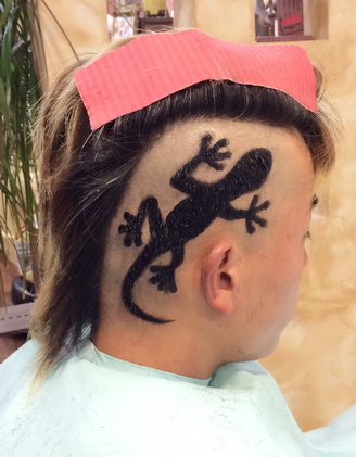| sugitanikun いつもいろんなスタイルに挑戦してくれる彼 今回はレザーアートでトカゲを表現!! |