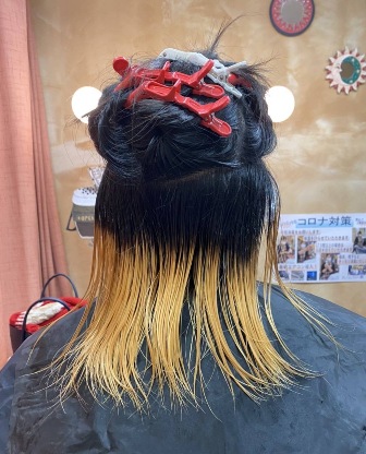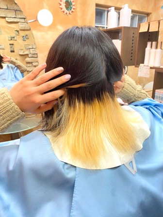 ![]() 今回は2回ブリーチ後にブラウンをかぶせるダブルカラーです! |