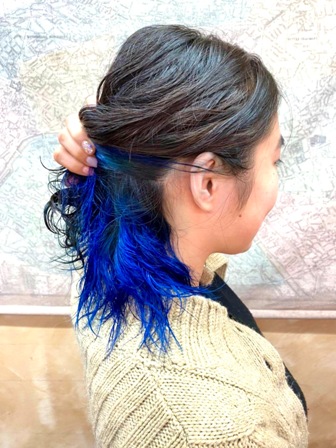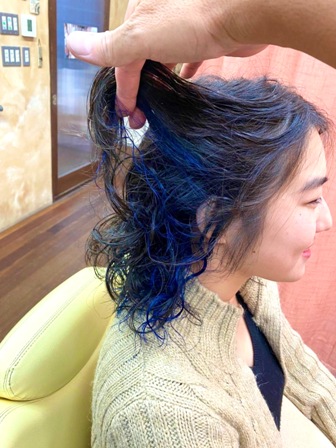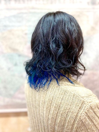 y/san イヤリングカラーなどのインナーカラーとパーマをしました。 ブルー系のインディゴをブリーチした髪に入れました。 パーマは全体に大き目のカールで柔らかく入れました。 その工程もご覧ください。 |